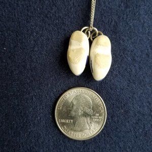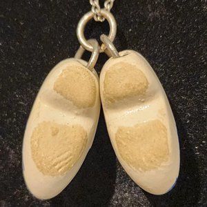 Vintage (circa 1970s) pair of Blue Delft porcelain Dutch clogs pendant (approx. 3/4" x 3/8" each clog) on silver tone metal chain necklace (approx. 17.5"). Hand painted. Unglazed soles. Good pre-owned condition. Please see the photos. The photos are part of the description. Smoke-free home.