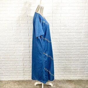 Vintage Blue Denim Maxi Dress Floral Embroidery Size Large