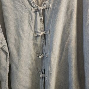 Roman's Stylish blue denim button-up. Features unique button details apron smock oversized shirt. size 2xl