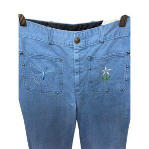 These vintage blue pants, made in Canada, showcase a unique butterfly and flower embroidery on the front pockets. Crafted from 100% cotton, they offer breathable comfort and durability. The flared leg adds a touch of retro style, making them a standout choice for those looking to add character to their wardrobe.