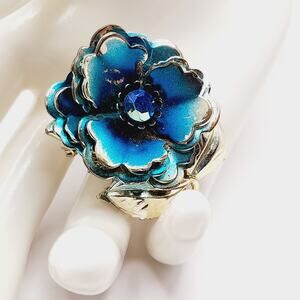 This vintage blue enamel flower brooch sparkles with aurora borealis rhinestones set in a sleek silver-tone metal. Measuring approximately 1 3/4 inches, it features layered enamel petals with shimmering accents that catch the light beautifully. A versatile piece that can be worn on jackets, blouses, scarves, or hats, adding a touch of vintage charm to any outfit.