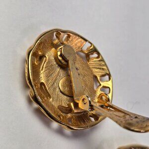 Add timeless retro charm to your look with these vintage clip-on earrings featuring deep cobalt blue enamel cabochons framed by an elegant gold-tone open scroll design. Crafted in the USA with classic mid-century style, they capture the glamour of 1960s–1980s costume jewelry — perfect for collectors, film wardrobe, or a bold statement accessory.
