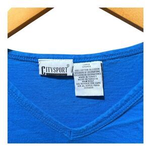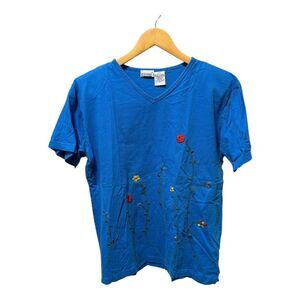 Vintage Blue Floral Embroidered T-Shirt Shoulder Pads Womens