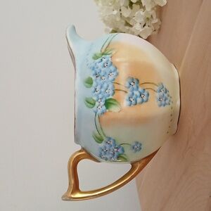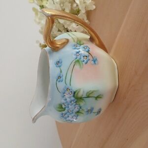 Vintage or antique, this 3-piece handpainted sugar and creamer is in excellent used condition. Considering its age, there is some wear to the gold around the rim of the creamer and to the tip of the handle. However, no damage noted.