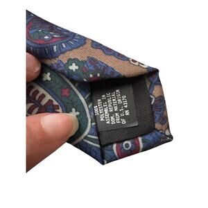 From Italianismmo is this lovely blue polyester necktie with a colorful paisley pattern on it. No flaws to note. Cleaned and stored in a smoke free home.