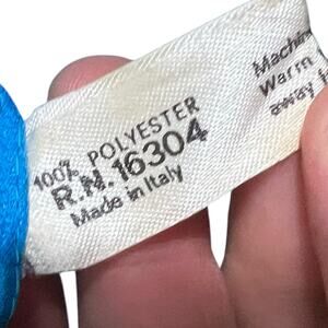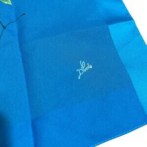 This beautiful vintage scarf is a striking piece featuring hand-painted floral designs on a vibrant blue polyester fabric. The artwork includes a combination of soft blues, rich browns, and lush greens, creating an elegant contrast. The scarf is marked "Producto en Puerto Rico" and "Made in Italy," reflecting its high-quality craftsmanship. It is made of 100% polyester, offering both durability and a soft, smooth texture. The edges are neatly finished, and the design includes large, beautiful flowers arranged in a scattered pattern across the fabric.