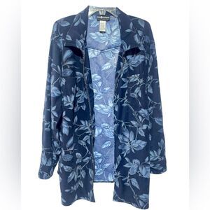 Vibrant blue floral jacket with a zip front makes a stylish mini shirt dress, but can be worn as a versatile layering piece.