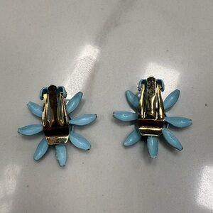 These are vintage-style clip-on earrings designed to resemble daisy or sunburst flowers. Each earring features a circular center and multiple elongated blue enamel petals, all set on a gold-tone metal base. The enamel has a glossy finish, and the clip-back style suggests mid-20th century costume jewelry, likely from the 1950s–1970s era.