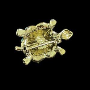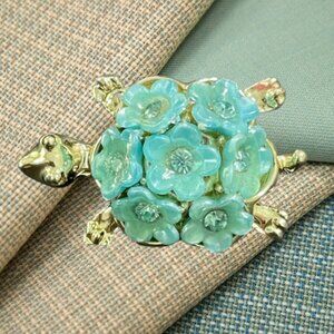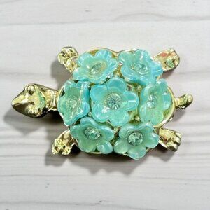 Cute vintage 1960s turtle pin. Gold tone turtle with blue flowers and blue rhinestones. Turtle measures 13/8" and has a working safety clasp. Brooch is in excellent condition.
