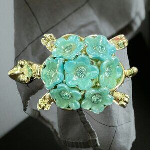 Vintage Blue Flower Gold Tone Turtle Brooch 1960s Cute Figural Pin