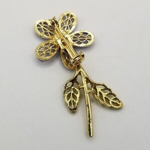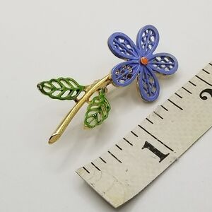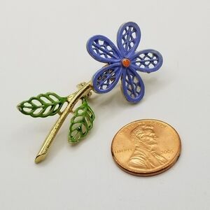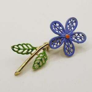 Vintage Blue Flower Power Metal Brooch Pin Gold Tone Painted Cutout 2 Inch