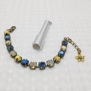 *Description: This is a beautiful blue and gold rhinestone link bracelet on a brass background from the 1990s. The rhinestones are all prong set and are blue, gold, aurora borealis, lighter blue, and an opalescent rhinestone. There is a flower charm on the end of the extension chain. You could adjust this bracelet from 6 1/2 inches to 8 inches. The rhinestones are full of sparkle and shine. This would be a great addition to your vintage jewelry collection or make a great vintage gift!