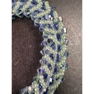 This gorgeous pre-owned artisan-made bracelet features a striking chevron braid design created with brilliant crystal bicone beads and glass seed beads. The blue and pale seafoam green (aquamarine) beads are intricately woven, giving the piece incredible texture and shimmer. Dating to the Y2K/Early 2000s era, this piece is a beautiful example of quality costume jewelry. It secures with a decorative silver-toned base metal toggle clasp.