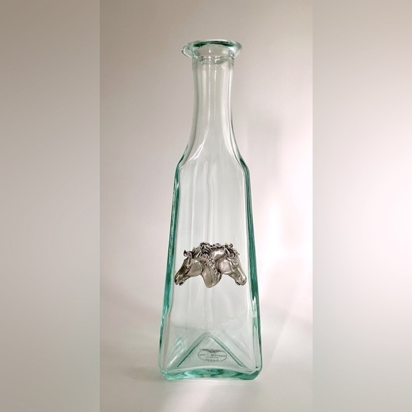 Vintage Blue Green Glass Bottle 9.5” Pewter Horse Medallion Heritage Metalworks