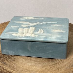 Vintage Blue Incolay Jewelry Trinket Box Seagulls Ocean Beach Birds 5.5”x4”