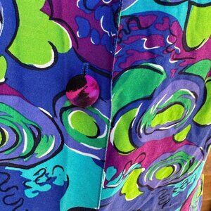 The colors on this top are gorgeous! It has shoulder pads. It is missing a button and has some miss matched buttons also it is missing its tags. Fits like a medium but refer to measurements for proper fit and feels like Rayon.