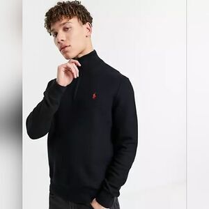 New with Tags | Vintage Blue Label Polo Ralph Lauren Half Zip Pullover Sweater Polo Black, Mock-Neck | XXL | MSRP $220 | 100٪ Cotton | Red Embroidered Pony on front | Measurements Laying Flat and Unstretched: Pit to pit 26" | Length 29" | Sleeve Length 26" | Leather Zipper Pull | Made in the USA!