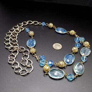 The necklace has no clasp — it easily slips over the head for a comfortable, effortless look. The combination of translucent blue beads and metallic tones gives it a light, elegant sparkle perfect for day or evening wear.