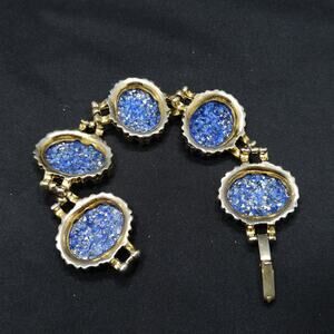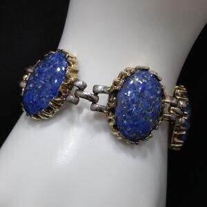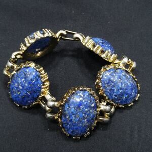 *Description: Great five link dark blue Lucite bracelet with confetti and glitter cabochons from the 1950s. The metal is gold tone but silver tone metal shows through in places of greatest wear. It is a classic mid-century confetti Lucite link bracelet. This would be a great addition to your vintage jewelry collection or make a great vintage gift!