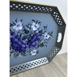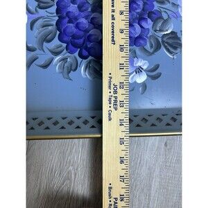 Vintage Blue Metal Nashco Tole Ware Tray Gold Trim Purple Flowers Hand Painted