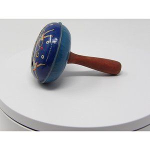 Vintage Blue Metal Noisemaker Rattle Featuring Girls Jumping Rope & Wooden Handl