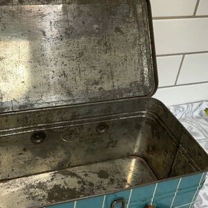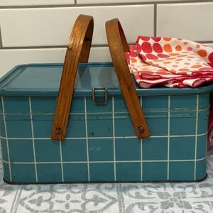 Vintage Blue Metal Picnic Basket with Wooden Handles