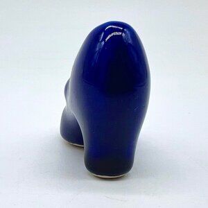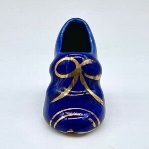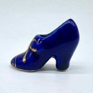 Blue ceramic shoe figurine with hand-painted gold bow details. A striking little collectible that adds color and charm to a curio shelf or vintage display.