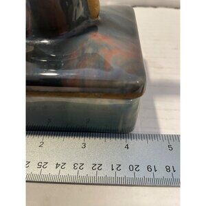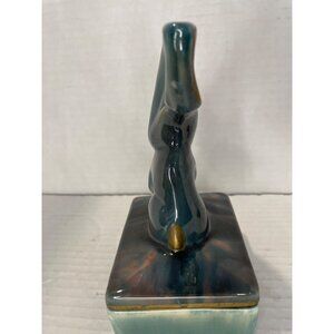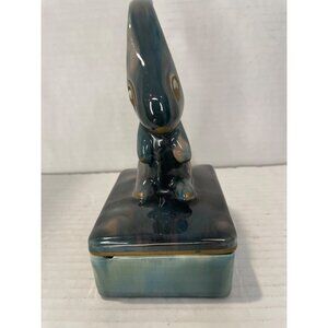 VINTAGE BLUE GREEN BROWN POTTERY Bunny Treasure Box FIGURINE 7” Canada. This vintage figurine is a charming addition to any collection. Crafted from ceramic using pottery techniques in Canada, it features a cute bunny design in shades of blue, green, and brown. Measuring 7” inches in height, it is perfect for display on a shelf or desk. The figurine is branded with the Blue Mountain label and is sure to appeal to dog lovers and collectors alike. Its production technique adds to its unique charm and makes it a one-of-a-kind piece. There is a signature, and it is marked with #77633. It is in excellent condition except for one chip that is at the top of the box but unable to see it when it is displayed. Price is reflective with the chip.