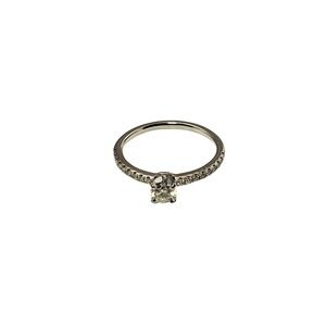 This sparkling engagement ring features one center round brilliant cut diamond (.32 ct.) accented with 18 pave set diamonds on its band. Shank: 1.5 mm.