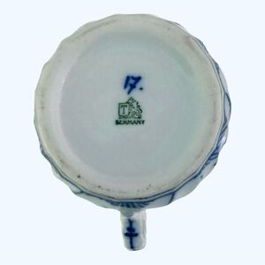 The Vintage Blue Onion Demitasse Tea Cup is a charming piece of dinnerware that showcases intricate hand-painted cobalt blue detailing on fine porcelain. Made in Germany post-1940, this collectible tea cup features the signature Blue Onion design and signed T lion, Germany, adding a touch of vintage elegance to any tea-drinking experience. Cup has no cracks but a small chip on scalloped rim.