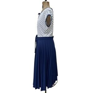 Lovely vintage navy blue and polka dot shirt dress. I believe it's from the 60s. It has little cap sleeve and a blue belt to go with it. The skirt is pleated and it has a little bow at the collar. Zips up the back. The only flaw is that where the belt was is darker than the rest of the skirt (see photo) but with the belt on you don't even notice it. Otherwise in great shape, cleaned and stored in a smoke-free home.