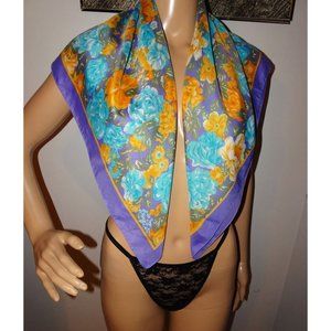 Vintage Blue & Purple Extra Large Floral Scarf square shaped flowers leaves 70s