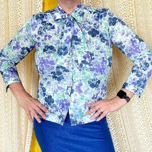 Vintage Blue Purple Green Floral Secretary Necktie Blouse Size L