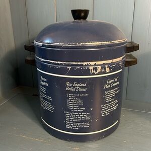 Charming blue pot with printed recipes. Perfect for cooking enthusiasts. Awesome Vintage Blue Metal Cooking Pot with Lid and Basket Pot for Boil