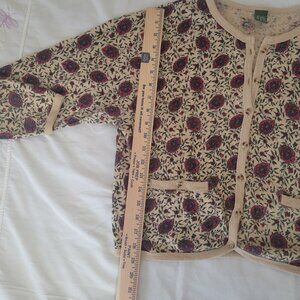 Pretty cardigan with blue flowers surrounded by red on a tan background