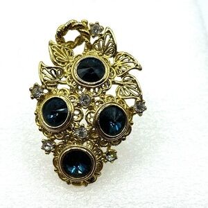 Vintage Blue Rhinestone Brooch Filigree Gold Tone Vintage signed Avante Large