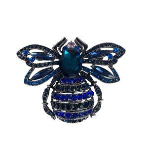 Vintage Blue Rhinestone Encrusted Bumble Bee Brooch Pin Silver Tone Setting