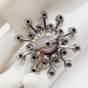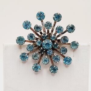 This beautiful vintage brooch features sparkling blue rhinestones in a bold starburst design. The rhinestones are prong set in silver-tone metal with an atomic, mid-century modern feel. Measuring a little over 1 1/4 inches, this brooch is the perfect accent piece to add retro flair to your outfit or collection.