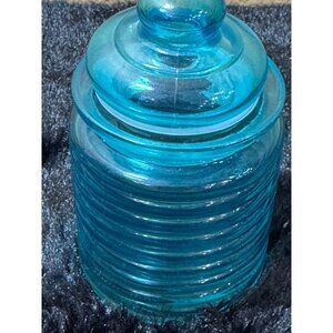 Vintage Blue Ribbed Honey Comb Glass Storage Jar With Lid