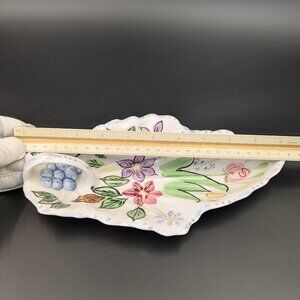 Bring a touch of timeless Southern charm to your table with this vintage Blue Ridge Southern Potteries handled celery dish. This hand painted collectible piece features a graceful leaf-shaped form with a delicate handle, showcasing the artistry that made Blue Ridge pottery so beloved. The design highlights colorful spring flowers in shades of pink, yellow, and purple all hand-painted against white background. Each piece of Blue Ridge pottery was individually decorated, making this dish truly one-of-a-kind.