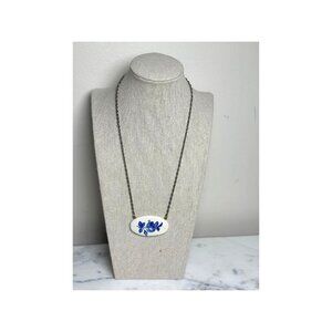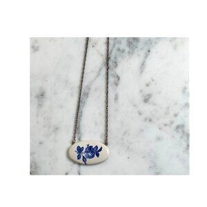 A ceramic pendant necklace featuring a charming blue rose design. Brass chain complements the vintage aesthetic, making it a stylish accessory for any outfit.