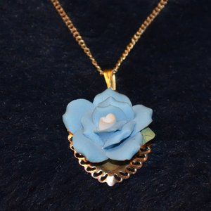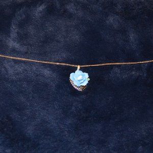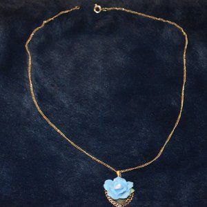 Vintage Blue Rose w/ Gold Heart Chained Necklace