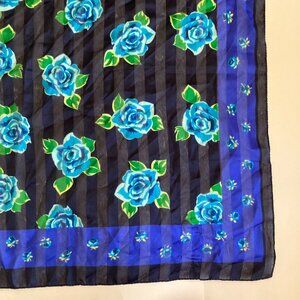 Vintage Blue Roses Rose Flower Scarf Floral 20 X 20" Made in Italy Chiffon Green