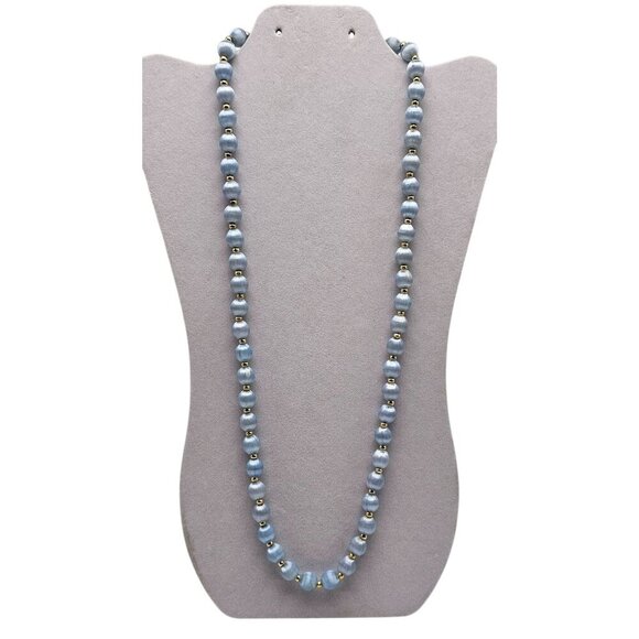 This elegant necklace features blue satin beads paired with gold-tone spacers, offering a timeless and sophisticated look. Ideal for formal attire or professional settings, this piece adds a touch of class to any outfit. Its vintage appeal is enhanced by the subtle sheen of the satin finish.