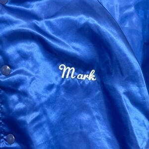 Awesome Reno Nevada vintage bowling blue satin jacket, has name MARK embroidered in the front, great for a Mark or can patch over the name with any patch, killer rear vintage art, great color, smoke free, MINTY
