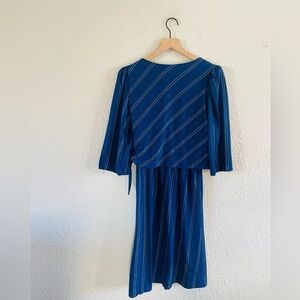 Top has a blouse like style, skirt stretches at the waist, buttons on the shoulder