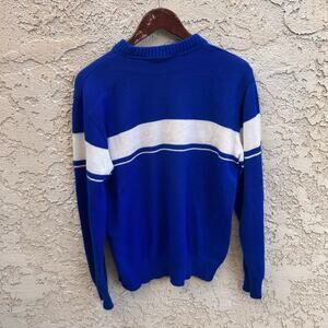 Vintage crewneck sweater in a bold cobalt blue with contrasting white stripe across the chest and sleeves. Classic 90s/00s emo-indie energy - feels like something straight out of a garage band basement show or a moody film still. Soft knit, relaxed fit, perfect for layering over a tee or styling with ripped denim. Great vintage condition.
