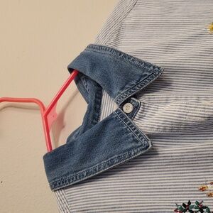 Stylish women's shirt featuring a blue striped pattern and a denim collar. Perfect for casual outings or festive occasions.