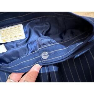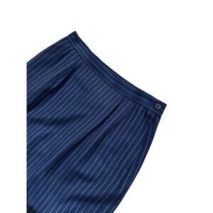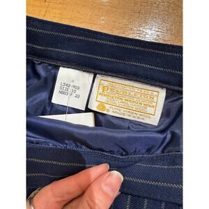 Vintage navy blue striped with tan pin stripping Pendleton wool pencil skirt. Marked a vintage size 10, but the waist measures 28" which fits more like a modern 8. Has one pocket and zips and buttons at the other side. No flaws to note. You can't beat a quality Pendleton piece and it's lined with likely poly or acetate so no itch! The lady of the estate liked this style so much - she bought two! So I have two identical skirts available with the same measurements and conditions.