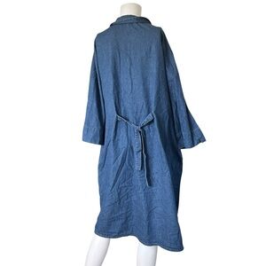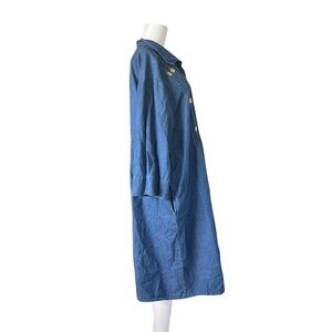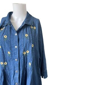 Cute long sleeve dress with button front closure and pockets. Pleated detail and embroidered flowers on the chest. 100% cotton. No size tag; see measurements for best fit.
